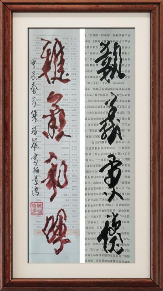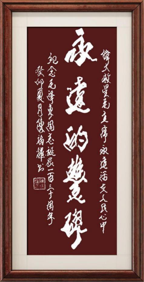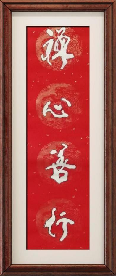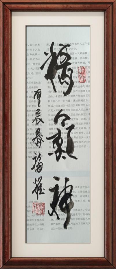 这幅作品创作的构想源于我的创作理念:不忘初心跟党走,笔墨丹青颂党恩。人类的初心是共存谋福。毛主席,中国共产党的初心也是为人民谋幸福。主席传承了馬列主义、毛泽东思想,提出中国夢:振中华繁荣,兴世界昌盛,一带一路,构建人类命运共同休,并向世界和平之路,故,以书法的形式撰写了这副对联。这幅作品参加 2024 年艺术与和平一一首届国际艺术名家网络双年展中被活动组委会评为优秀作品奖。并颁发了奖杯,证书,微章。