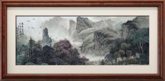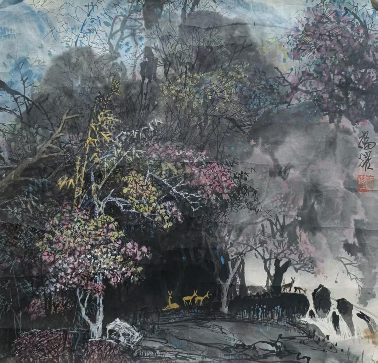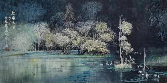 这幅画創作有感于主席提出我们如何正确处理人类与地球生物共存的关系。人类的初心是共存媒福,何为福,滿足人的五官、手脚的快感就是福,人体外的一切环境,是营造幸福的元素,这些元素也就是与人相处的环境需人正确去处理。我以绿化环境这一主题耒表现地球一切生物共存快乐这一哲理。在构图上我以一群白鹤在深山湖里戏水飞翔。营造一个美丽的环境、一切生物方能相互依存,欢乐一堂。