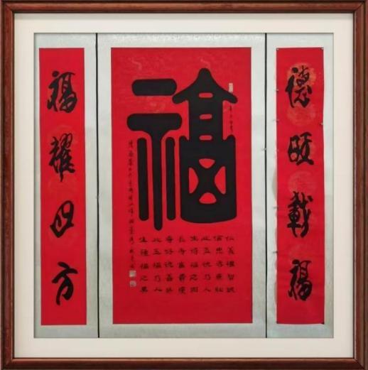 我以中国优秀传统文化:书法的形式进行创作。为了准确表达曹德旺先生的幸福观,我以中堂形式:中堂上方一个大福字,下方几排小字,是描写得福之因,种福之果。对联上联是德旺載福,下联是福耀四方。上联开头是他的名字,下是联是他公司的名, 这样反映一个人的道德波涛峰起,伟业功成必到的一种规律。